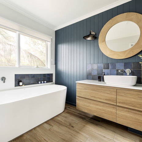A touch of the coastal vibe. Navy VJ panels with blue tiles to match, offset by the beautiful light timber vanity and timber look floor tiles. Polished wall lights and classic look tap ware complete the space.